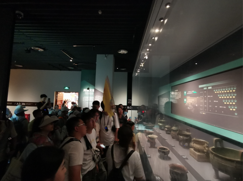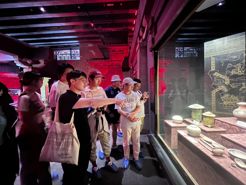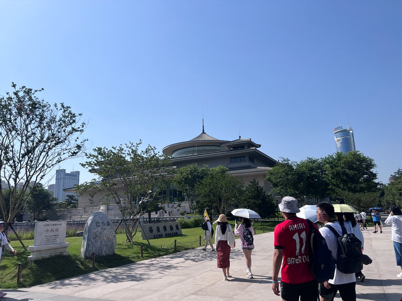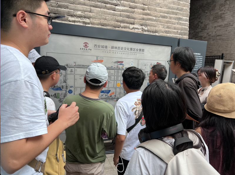 7月9日清晨,师生一行抵达了本次西安考察的第一站——西安博物院。西安博物院的基本陈设以“古都西安”为主题,立足西安三千余年的建城史与一千多年的建都史,以西安本地出土的历代文物为基础,纵向上以时代为序,依次呈现了西安城由西周丰镐,至汉长安城,再到隋唐长安、明清西安的城市发展史,集中反映周秦以来历代都城规模、格局以及唐代以后城市的发展变化情况;横向上又由城市发展延伸到城市生活,以“周秦文明”“汉唐风采”与“府城华章”为视角,从不同侧面生动再现了各繁华时期西安城内帝王将相、市井百姓的生活实态与万千气象。饱含中古祆教风格的史君墓石椁的各种细节,更是给大家留下深刻印象。西安博物院整体上由博物馆主体、荐福寺、小雁塔三部分组成,但因天气炎热加之游人众多,荐福寺与小雁塔都只得惊鸿一瞥,未及细赏,实属遗憾。