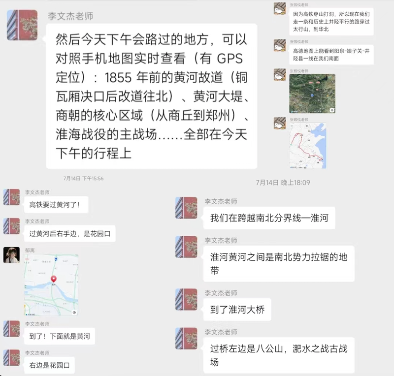 值得一提的是,在惯常由“点”到“点”的考察之外,本次考察的师生们格外重视“在路上”的学习与经历:在自由活动的时间段,大家拿上古地图,穿梭于古城的大街小巷,寻找巡抚衙门、府城、附郭县县衙、满城遗迹,从古今地名等蛛丝马迹中,发掘并感受与我们同享一个空间的异时代的人们生活的角角落落。在往返途中的高铁窗外,车行的路旁,每至重要地点,随行的老师们都会即时向同学们拓展相应的知识与背景——殷商旧地、黄河故道、淮河大桥、淮海战役主战场、淝水之战古战场……列车行进在广袤的华夏大地,无数历史与记忆扑面而来,又飞速向后略去,视通万里,思接千载,历史记忆与眼前风景仿佛穿越时代般的碰撞交融,本应枯燥的行路过程也变成了交流与思考的宝贵课堂,相信如此特殊的经历与体验将会长留同学们心间。