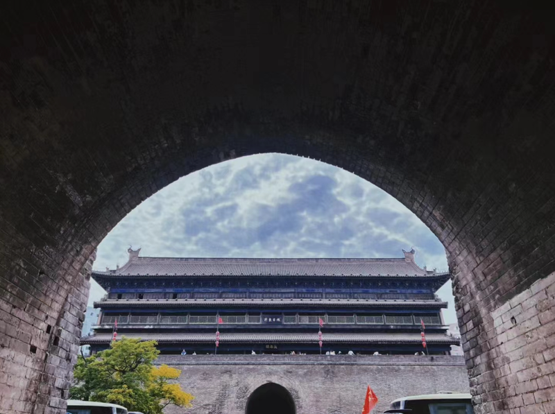 抵达西安的第四天,师生一行由东城墙正门长乐门登上西安城墙。西安城墙是中国现存规模最大、保存最完整的古代城垣,周长13.74公里。现存城墙始建于明洪武年间,以隋唐皇城的基础上修葺增建而来,是当时西安的府城,明清两代多有整肃修缮。西安城墙,初于四方各开城门一座,东门曰长乐门,西门曰安定门,南门曰永宁门,北门曰安远门,取“长安永安”之意。清代西安城中的满城,以钟楼为西南点,向北至安远门,借用明代秦王府西墙,向东延伸至长乐门。清代陕甘/川陕总督署(清前期总督署,后期迁往兰州)、陕西巡抚署、藩臬两司、西安府署、贡院、附郭县长安县,都集中在满城西边。民国时期,增开中山门、勿幕门、玉祥门、解放门四座,中华人民共和国成立后又先后增开和平门、文昌门、朝阳门等十座,西安城墙上今计有大小城门十八座。考察行程安排上下城均在长乐门,师生们可以自由选择游览方式,或可长乐门周围就近寻找箭楼、正楼、角楼、敌楼、女儿墙、垛口等军事设施遗存,近距离体会古城墙的历史背景和文化内涵,体会百年前“二虎守长安”的历史现场;或可骑车绕城墙一周,沉浸式感悟西安城市的历史沉淀和繁荣发展。站在城墙边放眼望去,既可以欣赏城墙内广仁寺、碑林博物馆等历史建筑,城墙外的护城河、环城林带等自然风光,也可以看到城下川流不息的车流人海,远处繁华富丽的城市天际。漫步在西安城墙上,传统与现代、历史与现实、安静与繁荣,仿佛真的在此撞了个满怀。
