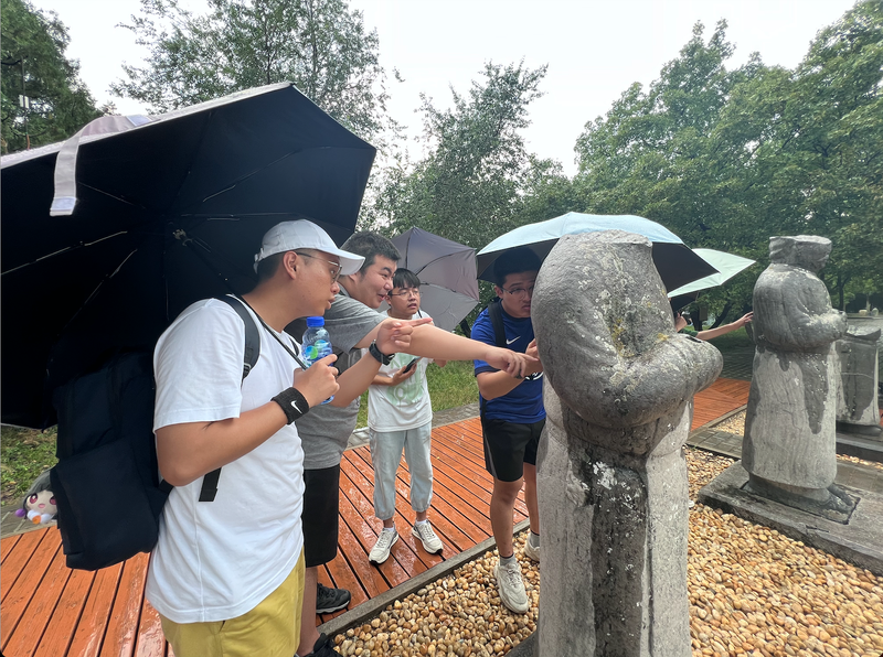 12日下午,师生一行前往陕西省咸阳市乾县,参观“唐十八陵”之一的唐乾陵博物院。乾陵为唐高宗李治与女皇武则天的合葬墓,是唐帝陵中规格最高、保存最完整、艺术价值最高的一座,以其“因山为陵”的建造方式居于今乾县北部的梁山上。乾陵仿照长安城营建的种种陵园地面建筑均已不存,保存相对完好的是主陵司马神道两侧对称排列做工精美的百余石雕与石碑,张凯悦老师带领同学们驻足“无字碑”前,详细研读碑上历代游人的题字;流连于六十一蕃臣像间,感受“万国衣冠拜冕旒”的盛唐气象。此外,考察队伍还参观了乾陵现已发掘并对外开放的陪葬墓中的两座——永泰公主墓与懿德太子墓,同学们在张凯悦老师的讲解下沿着墓道一路深入,既欣赏了两侧绚丽多彩的墓壁画和石椁上雕刻精美的线刻画,也领会了各式葬俗装饰背后的观念象征与文化变迁。