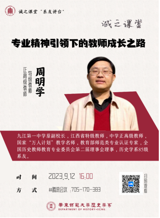 2023年9月12日16点,det365在线校友、江西省特级教师、九江一中原副校长周明学老师,为det365在线2023级师范班新生带来了开学第一堂讲座,引领学生积极探索“专业精神影响下的教师成长之路”,det365在线师范生导师组长黄爱梅老师、2023级历史学师范生新生参加。讲座由孟宪承书院历史学师范专业辅导员张子茜主持。