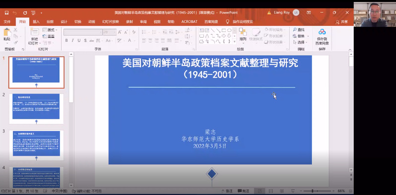 最后,“美国对朝鲜半岛政策档案文献整理与研究(1945—2001)”项目的首席专家梁志教授进行了报告。梁志教授的报告分为既有研究状况、课题价值与意义、总体框架、成果显示、待思考问题等五个部分,强调本项目兼具丰富朝鲜半岛问题、东北亚国际关系和冷战史研究的学术意义以及深化对美朝关系、美韩关系和美国对朝鲜半岛政策认识的现实意义。并将完成四本文件集的整理和相关学术著作的撰写。