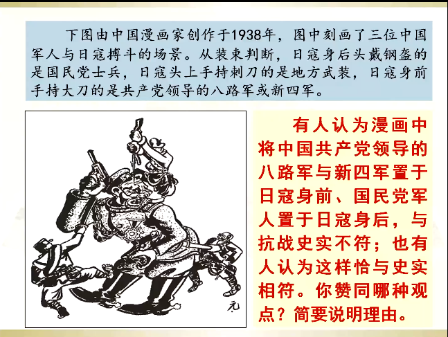 从选材的角度来说,於老师认为中学阶段历史作业设计的选材宜从既有知识、社会热点和生活经历入手。既有知识不一定是历史知识。为此,於老师以诗词、歌曲、漫画等为例证,展示如何运用各种素材去培养学生的历史思维,使学生明白解读这一类的史料需要从写实、艺术、作者和社会四个视角入手,由判断史料证史的信度与效度,再到对历史作出诠释评价。