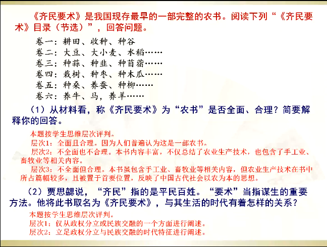 为“开放”的问题设定参考答案时,应对学生回答问题所蕴含的历史思维水平层次作出策略性的判断,并以此为依托和导向,鼓励学生历史思维能力的不断提升。於老师分别以《中国印刷术外传图》及《齐民要术》为例,讲解了“开放”性质的作业,参考答案如何有效地区分学生的思维层次。
