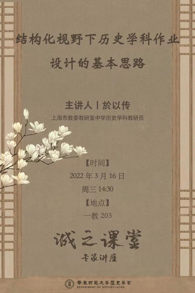 2022年3月16日下午,上海市教委教研室中学历史教研员於以传老师受邀,以线上会议的方式为我系同学带来了一场精彩的“诚之课堂”专家讲座。