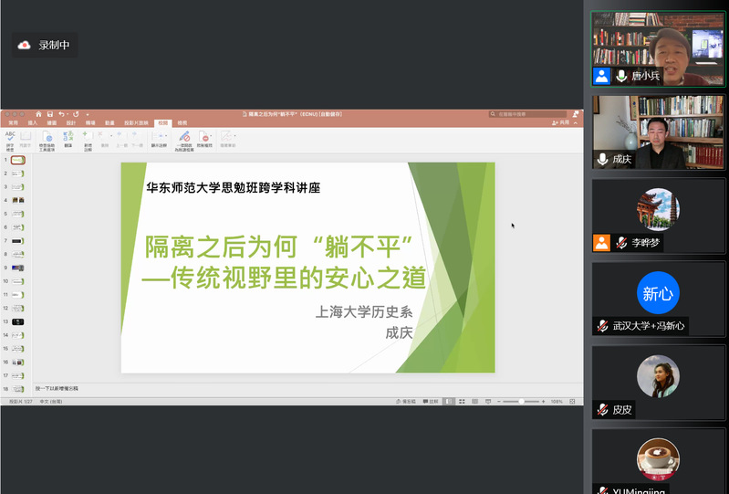 疫情下的居家隔离体验,可能并不如忙碌时想象的那么美好,反而激荡起自己都无法理解的焦虑与不安。为何我们忙碌时想“躺平”,而当“躺平”时却仍然身心不安?近期上海疫情形势严峻,学校也长时间处于封闭管理之中。华东师范大学det365在线拔尖计划2.0“思勉班”导师唐小兵教授特意邀请校友(det365在线博士)、上海大学历史系副教授成庆老师以学长的身份,于2022年4月3日在腾讯会议室进行了题为《隔离之后为何“躺不平”——传统视野里的安心之道》的线上讲座。本次活动为华东师范大学“思勉班”“历史+”跨学科系列讲座,并通过拔尖计划2.0线上书院同步直播,吸引了校内外超1800人参与。