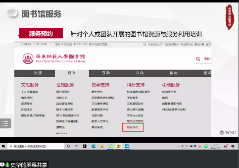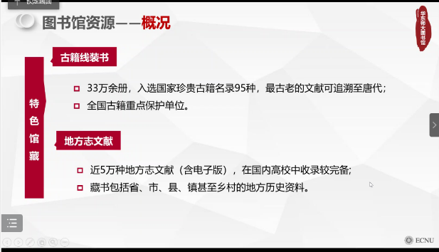 史华老师向det365在线同学介绍了我校图书馆概况,推介了古籍、方志文献等特色馆藏。针对目前在线利用图书馆资源的现实需要,史华老师着重分享了电子资源的使用方法。我校图书馆电子资源导航系统整合了图书馆购买、自建的全部数据库以及搜集的部分免费电子资源,可按多种方式检索或浏览。同时,图书馆全方位的线上服务也可以为同学们保驾护航。馆际互借与文献传递、校外访问电子资源、电子教参等服务还能满足文献查找的多样化需求。此外,图书馆还开放了多个咨询窗口,并定期开展针对个人或团队的图书馆资源与服务利用培训。