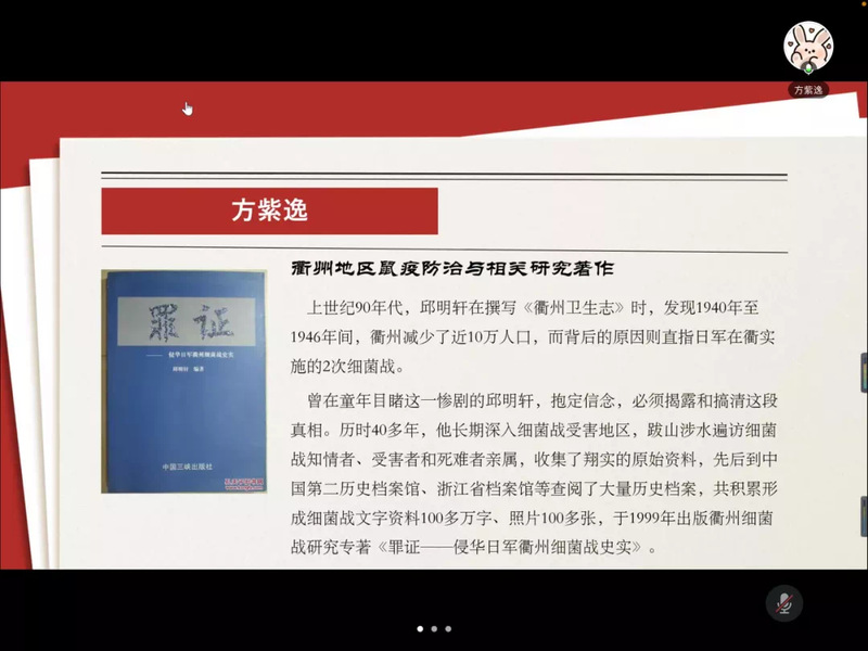支部党员围绕着“史学研究者笔下的疫情”这一主题进行了分享和研讨。穆德慧、彭蕊和李赵颖等几位同志分享了《大流感:历史上最致命瘟疫的史诗》《抗疫者家书》《瘟疫与人》等著作的读后感。疾病是人类历史的基本参数和决定因素之一,在以往的研究中疾病尽管直接关乎每个人的日常生活,但人们习以为常,很难想象它会对一系列重大事件产生重要影响,通过阅读这些著作让我们对于人类与环境、人类与疾病的关系做长远且深入地思考。方紫逸同志结合自己的本科毕业论文同大家分享衢州地区鼠疫防治与相关研究著作,介绍了1940-1946年日军在衢州实施的两次细菌战的历史。董婵媛同志结合自己的专业方向,节选了《圣经·列王纪下》的内容,通过直观的史料阅读,大家了解到公元前701年鼠疫发生的实况,提醒大家以谦逊的态度面对疫情,并对战胜疫情保持希望。
