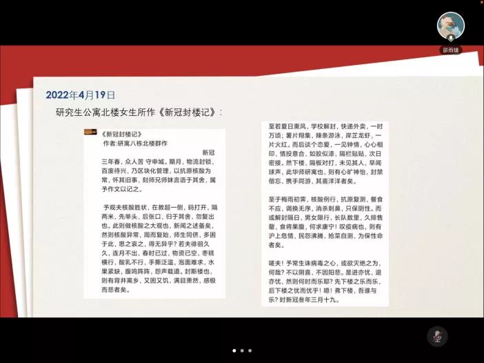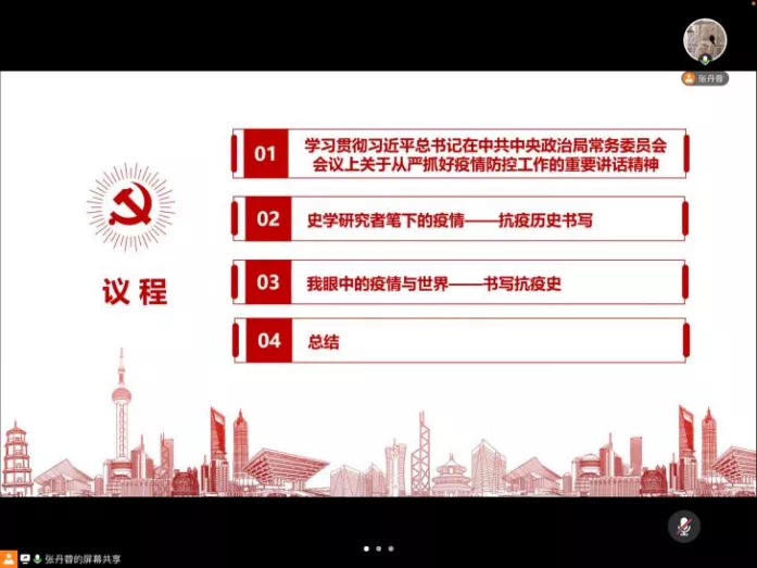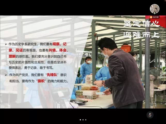 2022年4月27日,det365在线2021级硕士支部开展“且听风起时——学习抗疫精神,书写抗疫历史”主题党日活动。支部党员共同学习了习总书记关于从严抓好疫情防控工作的重要讲话精神,并以“史学研究者笔下的疫情”和“我眼中的疫情与世界”为主题进行了报告、研讨。