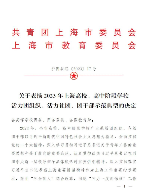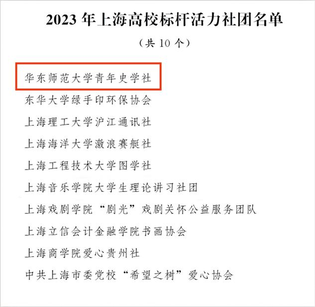 近日,共青团上海市委员会、上海市教育委员会公布了《关于表扬2023年上海高校、高中阶段学校活力团组织、活力社团、团干部示范典型的决定》,华东师范大学青年史学社获评2023年上海高校标杆活力社团,为10家获此殊荣的高校社团之一。