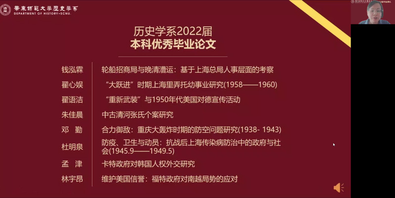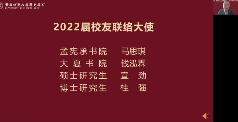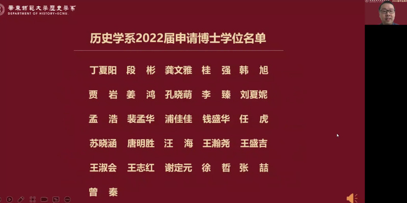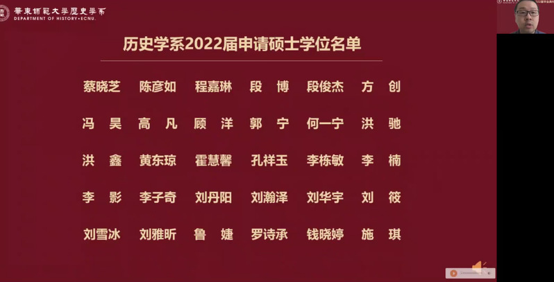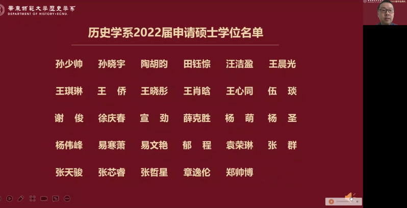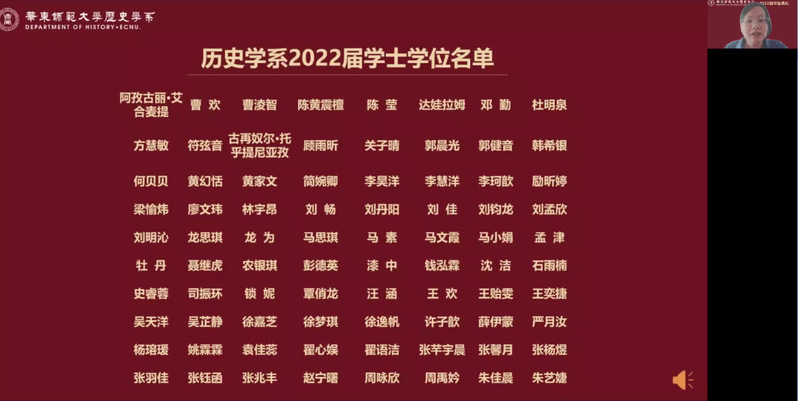 6月20日上午,det365在线2022届毕业典礼以腾讯会议的方式举行。系党委书记王东老师、主持工作副系主任梁志老师、孟宪承书院党委副书记万姗姗老师、大夏书院党委副书记栗蕊蕊老师、det365在线副系主任黄爱梅老师、副系主任瞿骏老师等出席了典礼,沈志华、沐涛、黄纯艳、林广、顾卫民、杨彪、王春来、李海峰、王进锋、李文杰、包诗卿、王悦、黄阿明、李晔梦、张锐、裘陈江等专任教师以及系学工行政教师线上观看“云典礼”,共同见证这场青春盛典。系党委副书记王应宪老师主持典礼。