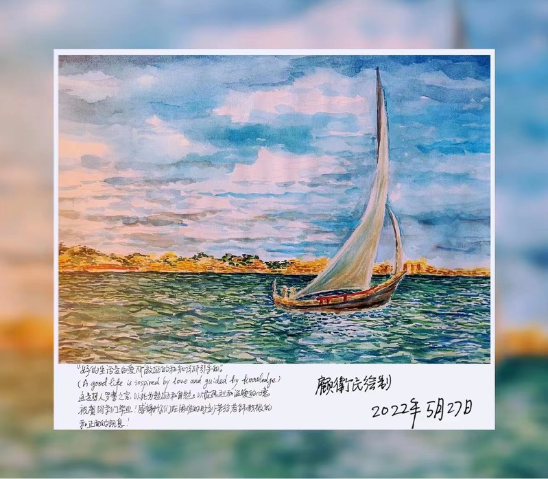顾卫民教授将亲自绘制的画作送给大家,并以哲人罗素的名言——“好的生活是由爱所激励的知识所引导的”——鼓励毕业生同学追求美好的未来。