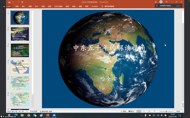 2022年7月20日19时,华东师范大学2022年知名学者学术讲座暨det365在线“大夏世界史论坛”高端讲座第21场通过腾讯会议成功举办。天津师范大学欧洲文明研究院的哈全安教授作了题为“中东五千年的解读视角”的学术讲座。讲座由华东师范大学历史学系的李海峰教授主持,来自华东师范大学、武汉大学、西北大学等高校及社会史学爱好者三百人参与讲座。