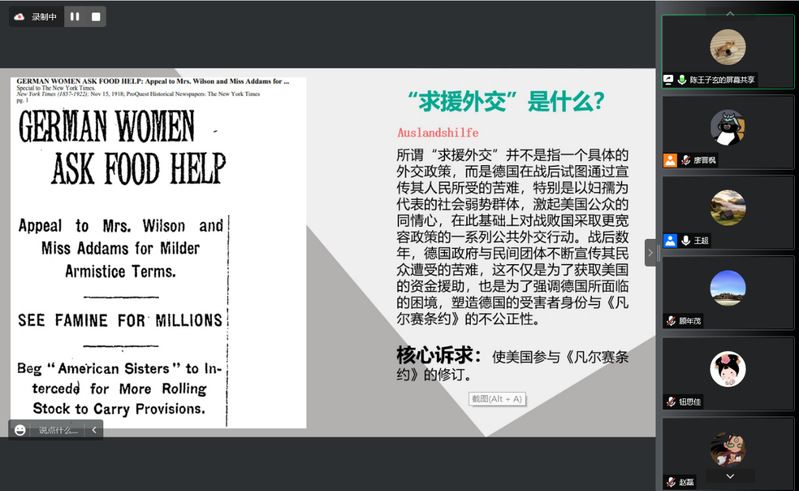 岳伟老师指出,同学们的选题新颖,研究材料也很充实,但仍然存在不少可以改进的问题。部分同学的文章存在文不对题的现象,标题范围太大或是太小,使读者在阅读文章时产生与标题的割裂感。同时,岳伟老师也强调应注意文章的结构安排,使分论点能层层递进,也要处理好分论点之间的交叉,使文章能够呈现完整的逻辑关系。在史料选用上,岳伟老师提醒学生,在将私人信函、文书等非规范性史料与官方文件等规范性史料交叉使用时,应注意对前者的史学价值作出解释,使自己的史料引用更具有信服力,而非前后不一,从而难以自圆其说。同理,在使用陌生且关联全文的重要概念(如“雅利安化”)时应引用权威资料,对其作出定义与解释,从而使文章符合学术规范,更具有信服力。