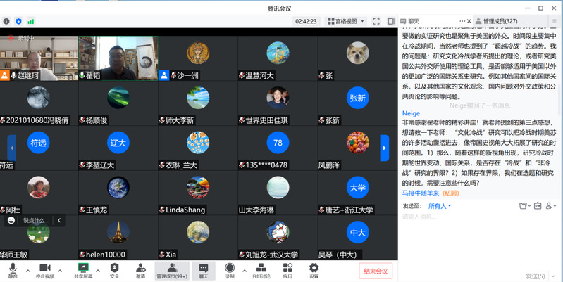 在讲座结尾,赵继珂老师对于讲座内容进行了简单的评议,认为这是一场颇具启发性的讲座,梳理了文化冷战研究学术史的来龙去脉,为学人们未来的研究提供思考与借鉴。参加讲座的老师或同学积极在留言区中展开互动交流,翟韬老师也一一细致回应,留言区中的提问源源不断,师生均觉意犹未尽。本次讲座在师生的热烈讨论中圆满结束。