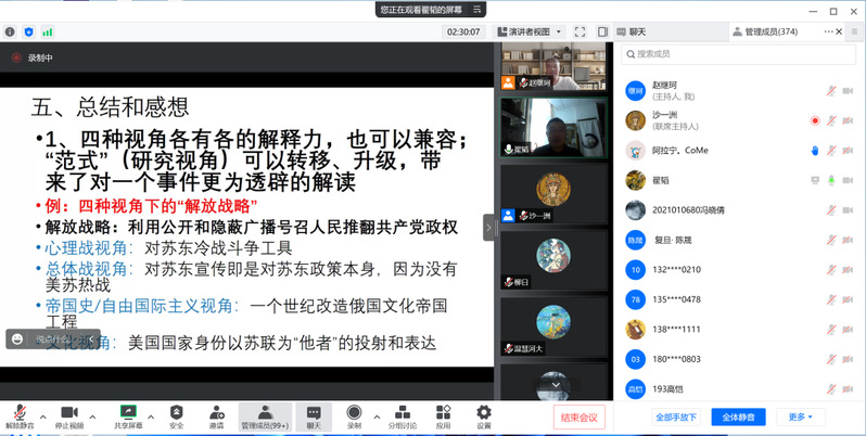 最后,翟韬老师总结,这四种视角各有其解释力,可以兼容并蓄,“范式”的转移、升级为事件提供了更为透彻的解读,使对历史事件的诠释愈发精微、全面。此外,翟韬老师还提出了几点思考:从文化冷战史研究的角度,外部因素对学术演进的影响是否被低估了?跨国史是否被过分强调?文化冷战史和冷战史是否遵循相同的政策演进逻辑?(美国)外宣史和(美国)外交史是否一致?