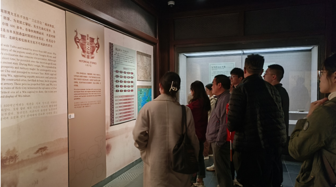 同日下午,考察队伍来到位于无锡与常州交界处的吴都阖闾城遗址博物馆。阖闾城始建于春秋晚期,大城城址呈长方形,内部又分东西两个方城,遗址现存大城部分城基和两小城的隔墙。博物馆以吴文化发展历程为主要脉络,着重介绍吴地自泰伯奔吴以来至吴王阖闾称霸时期的发展。博物馆各展厅内容丰富,展品上至春秋晚期的各式原始青瓷或陶制生活器具,下至六朝胥山古墓及宋墓出土的饰物,并结合3D影片等现代信息技术加以呈现,较为细致地展现了自春秋晚期以来吴地文明的演进。考察师生仔细驻足观看,不时就参观中发现的问题进行热烈讨论,加深了对于吴地文明的理解。