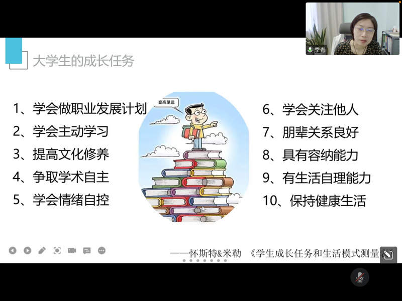 9月9日下午,心理健康教育与咨询中心季青老师主讲的新生心理健康教育讲座在线上召开。季老师分享了在遇到心理问题时如何自助以及求助的多种途径,通过具体分析展示了新生初入大学可能遭遇的心理不适感,例如焦虑、孤独、失落等情绪,给出了管理情绪的方法:勇敢表达自己的情绪,对情绪经验更加开放,进行适当运动,更多地亲近大自然等。季老师建议大家“爱人先爱己“,关心身边同学的非常状态,及时寻求帮助。