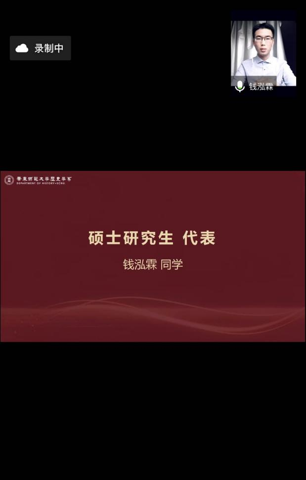 硕士研究生代表钱泓霖同学指出,既往四年的本科生活让他意识到历史学习是一种理性和良知的训练,培养的是缜密的思维和开阔的视野。我们正处在一个不确定性日趋增强的时代。而历史学给人以更清醒的目光,去更周全地审视这个世界。从一些看似艰涩的东西开始,去掌握求真的技能、积累贯通今古的智慧、培养对人类命运的关怀。祝愿大家笃行不怠,答时代之问,做一个有家国情怀的读书人。
