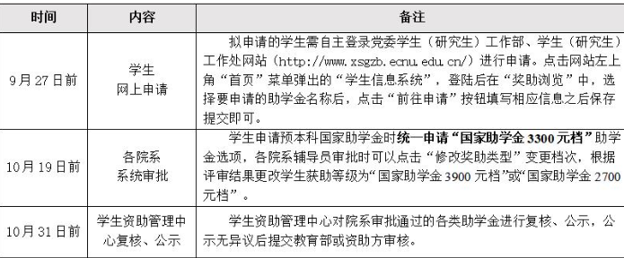 预本科生 国家助学金 | 平均3300 | 1、已通过我校家庭经济困难认定的预本科学生; 2、不含公费师范生; 3、原则上(1)通过认定的建档立卡等特殊困难学生应以第一档次全覆盖(2)特别困难、比较困难等级的新生应优先覆盖。 | 1、名额:14; 2、系统打印出来的《本专科生国家助学金申请表》纸质版一式一份于10月19日前提交到学生资助管理中心; 中北:大学生活动中心504 闵行:学生之家B304 3、电子版《国家助学金(预本科)获助学生名单汇总表》(详见附件2)请于10月19日前邮件发送到dlwang@admin.ecnu.edu.cn。 |