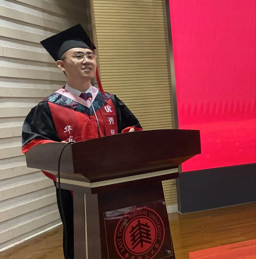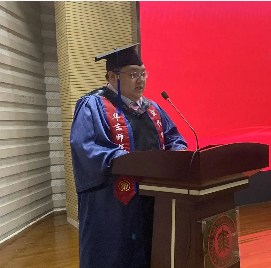 本科师范班毕业生代表尹智化的发言,围绕“体验”二字回忆大学经历:“我曾惊叹师长们渊博的学识,也曾佩服辅导员们勤勉的工作。我曾领略过文史哲书籍的丰富多彩,也曾烦恼过论文科创的纷繁复杂。我曾在支教中获得感动,也曾在交流中获得成长。我曾为了教学比赛而通宵达旦,也曾为了班级活动而绞尽脑汁。”尹同学谈及自己在支教服务中,真切体验到教育工作需要承担的责任与担当——“对我而言,华师大的四年里,我更加坚定了对师道的信仰”。