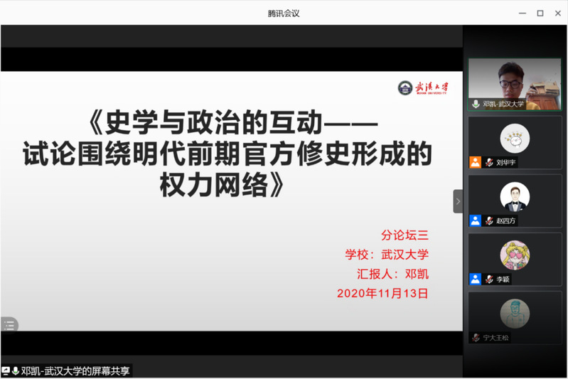 2020年11月14日至15日,第二届全国中国史研究生论坛于线上召开。此次论坛由华东师范大学研究生院和det365在线主办,来自北京大学、北京师范大学、复旦大学、湖南大学、华中师范大学、暨南大学、京都大学、兰州大学、宁波大学、清华大学、山东大学、山东师范大学、上海师范大学、武汉大学、西南大学、香港大学、浙江大学、中国科学技术大学、中国政法大学、中山大学等20余所大学的31名优秀研究生参与论坛。