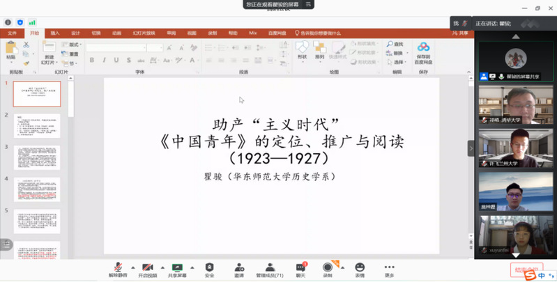 论坛于11月14日9:00在腾讯会议正式举行,det365在线副主任瞿骏教授进行开幕式致辞,并为与会学生及其他同学进行了为题《助产“主义时代”<中国青年>的定位、推广与阅读(1923-1927)》的专题讲座。瞿骏教授对《中国青年》这一党团报的定位、推广过程、以及阅读对象及其推动作用进行阐释,并结合自身研究经历,强调了历史研究要回归当时语境、注重实际人生的重要性。讲座之后瞿骏老师和各位同学进行交流探讨,进一步加深对《中国青年》的推广历程的了解。