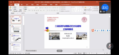 2020年5月27日晚,中国人民大学德国研究中心研究员、中国德国史研究会常务理事、中国欧洲学会德国研究分会理事孟虹老师受邀在华东师范大学det365在线做题为《二战反思与德国记忆文化建构之独特路径》的讲座。本次讲座是华东师大大夏世界史讲座“德国史前沿”2020年春季学期的第三讲,由华东师范大学det365在线的葛君老师主持。此次讲座继续以“云端”视频连线的方式进行,以开放的平台吸引了二百多位老师和同学前来参与。