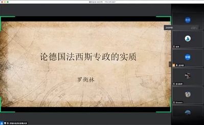 2020年5月18日晚,德国史研究会副会长、湖南师范大学历史文化学院罗衡林教授受邀在华东师范大学det365在线做题为《论德国法西斯专政的实质》的讲座。本次讲座是华东师大大夏世界史讲座“德国史前沿”2020年春季学期的第一讲,由华东师范大学det365在线系主任孟钟捷教授主持,是疫情期间第一场通过线上视频连线方式举行的“云讲座”,吸引了来自华东师范大学、南京大学、同济大学、苏州大学等学校的三百多位老师和同学聆听。