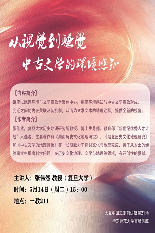 讲座以地理环境与文学意象为聚焦中心,揭示环境感知与中古文学意象形成、变迁之间的内在关联及其机制,从而为文学文本的地理诠释提供全新的视角。
