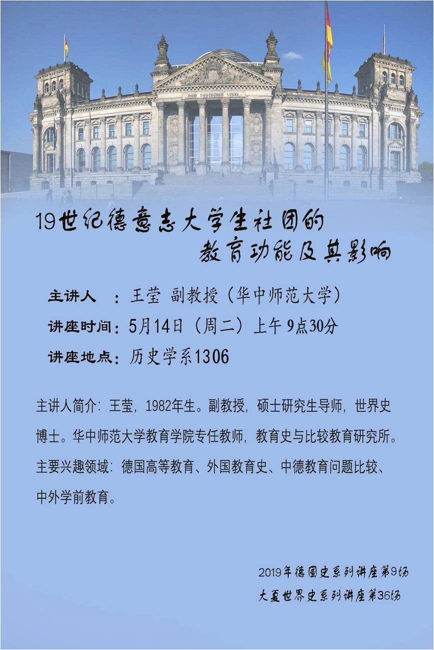 2019德国史系列讲座第9场 大夏世界史系列讲座 第 33 场 讲座题目:19世纪德意志大学生社团的教育功能及其影响 主讲人:王莹 副教授 (华中师范大学教育学院) 时间:2019年5月14日(星期二)上午9点30分 地点:det365在线1306室 讲座主要内容: 在德意志高等教育发展的过程中,大学生社团的组织生活与高校生活紧密相连,社团也成为德高校的一大特色。它不仅仅是一种学生组织,起着培养新人的作用,而且还与国家事务紧密联系在一起,这种育人功能可以被称为“新骑士制度”。在19世纪,在德意志民族-国家统一诉求的背景下,大学生社团逐渐成为一种教育手段,融合进高等教育的内核,它不仅作为一种学术自由的矫正力量登上了历史舞台,而且在其“性格培养”的制度下,使德意志高校的科学-职业教育功能更加完善。紧密的结社生活塑造了大学生的性格、培养了大学生的集体主义情结、并通过政治教育使民族-国家的观念深入人心,为德国大学生创造了一种特殊的生活方式和价值观念。此外,通过对此问题的探讨,介绍外国教育史研究的脉络,并分析其发展趋势。 主讲人简介: 王莹,女,1982年生。副教授,硕士研究生导师,世界史博士。华中师范大学教育学院专任教师,教育史与比较教育研究所。主要兴趣领域:德国高等教育、外国教育史、中德教育问题比较、中外学前教育。