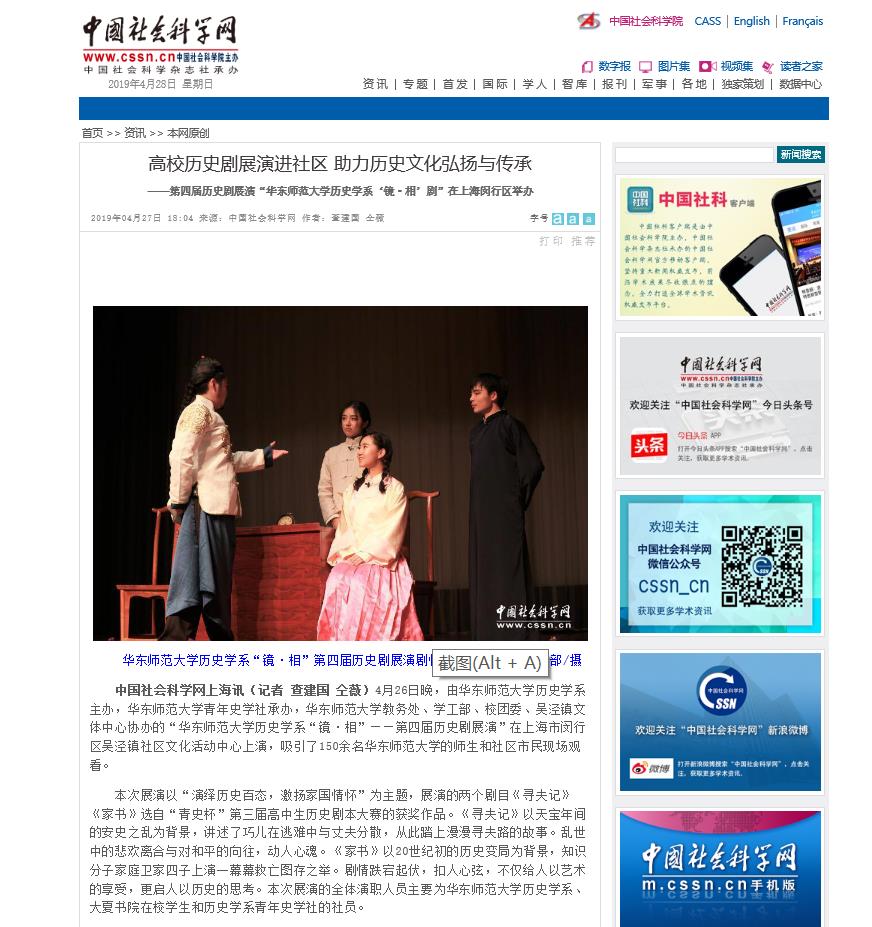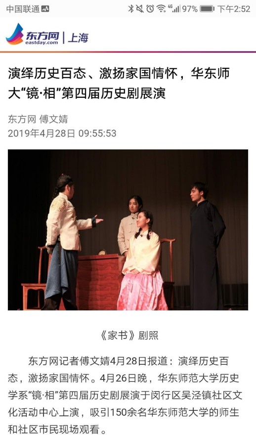 为响应上海团市委“积极引领青年‘往社区走’”的号召,今年,华东师范大学det365在线“镜・相”第四届历史剧展演首次与吴泾镇文体中心合作,走出校门,走进社区,吸引了当地众多市民前来观剧。通过市民群众喜闻乐见的展演形式,丰富社区文化生活,充分发挥高校服务社会的功能。也让高校青年学子走出校门,走进社区,弘扬中华优秀文化。