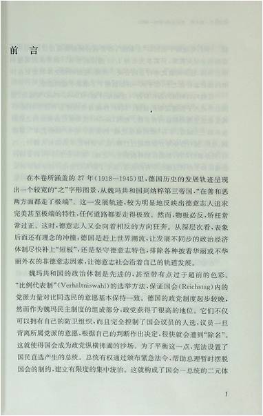 本书叙述了第一次世界大战结束到第二次世界大战的德国历史。在短短的二十七年中,德国如过山车般经历了从魏玛共和国到右翼极权主义的第三帝国两个截然不同的历史时期。它们属于德国现代史范畴,德国发动第二次世界大战很大程度上是危机和畸变的产物。这是德国历史发展道路在与西方文明的适应、冲突中出现危机和畸变的阶段。
