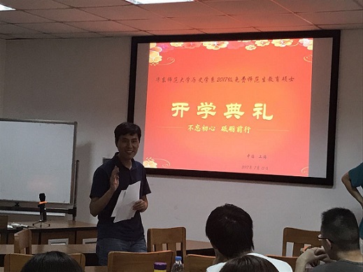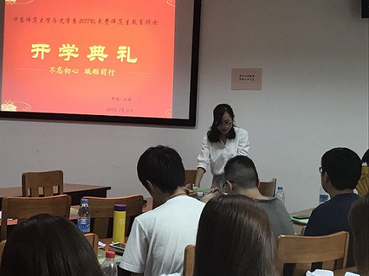 2017年7月15日下午,我系2017级免费师范生教育硕士开学典礼在系楼1206室举行。王东教授、孟钟捷教授、祝晓香老师及全体新生参加典礼。