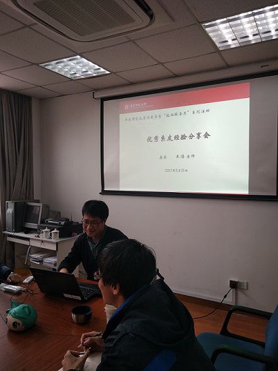 下午3时,优秀系友经验分享会第三场则在系楼1103举行。由我系博士毕业生,优秀青年教师王传老师主讲。王传老师从博士生的学习和生活现状引入,对我们提出了殷切的期盼。随后,会场沉浸在深入的讨论之中。王传老师见解独到,语言幽默,对我们关于大学期间读书与生活的一些疑惑,做了精彩的解答。