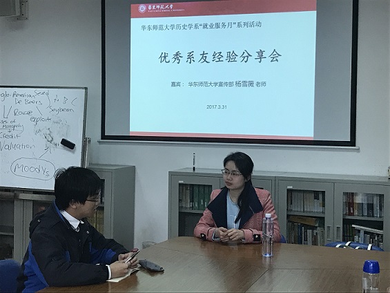 3月31日下午1时,det365在线优秀系友经验分享会第二场在系楼1330顺利举行。由我系2013届硕士毕业生,现任职于华东师范大学宣传部的杨雪薇老师主讲。会场在轻松愉快的氛围中,以自由问答的形式,讨论了历史系毕业生在就业时的种种难题。杨老师认为,专业与工作没有绝对的必然联系。而综合素质的培养更加重要,毕业生应当从基础岗位做起,切实锻炼自己的能力。至于本科生,应当培养自己多方面的素质,杨老师举自己为例,她本科时曾担任校报记者,并获过宣传方面的奖项。这就对应聘宣传岗位很有帮助。至于研究生,认真对待学术,写好毕业论文,十分重要,一旦无法顺利毕业,则会影响到整个就业。最后,杨老师介绍了历史系学生可能从事的岗位,如公机关事业单位、编辑部门、媒体等的一些具体情况,使同学们对我系的就业前景及就业策略有了更完整的理解。