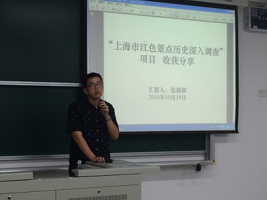 张越祺同学讲述了带领队员前往上海市红色景点实地调查的收获,主要关注上海市红色景点的开发保护情况与历史意义。