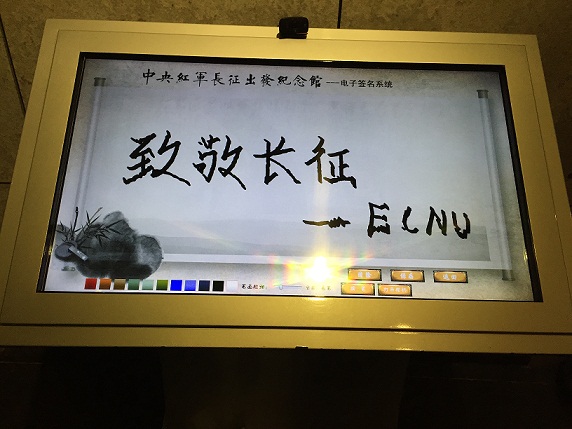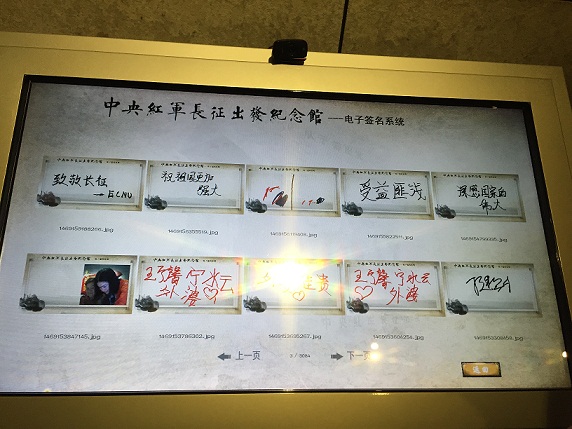 在热情的出租车司机的带领下,我们来到了于都中央红军长征出发地纪念园。此处出示身份证可以直接领票,不需要另外购买。园区建设在于都河畔,位于“长征第一渡”旁。纪念馆内还有一个可以签名的电子屏幕。虽然触屏很不灵敏,我还是艰难地留下了“致敬长征―ECNU”的签名。
