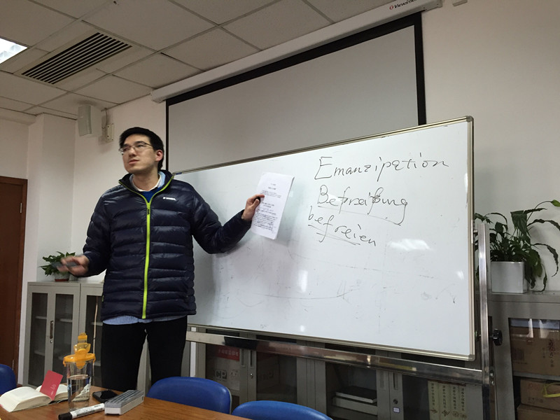 2016年3月16日下午1点,世界史方向研究生邀请到了葛君老师带领大家研读马克思的《论犹太人问题》。 《论犹太人问题》是马克思青年时代的重要文献。葛君老师通过对照德文版的文献,从德语词汇的翻译入手,结合近代德国的历史环境,逐句逐字地解读文献。在解读文献的过程中,还向同学们介绍德国哲学使用的专业术语,以便大家能更好理解文献。
