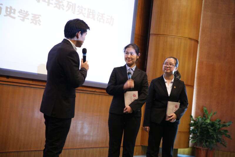 三位主持人致开场词后,大会正式开始。其中,历史系“以史为鉴,热爱和平――纪念抗战胜利70周年系列实践活动”项目,在全场第一个报告。由姚明辉同学与张羽同学主讲。