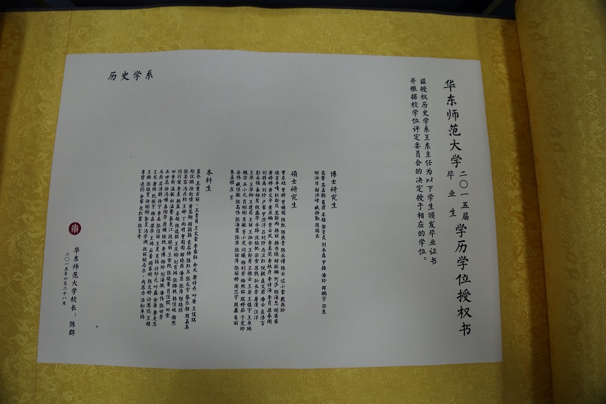 随后,李磊老师向同学们展示了明黄色的卷轴――陈群校长颁发的学历学位授权书,并进行了宣读。然后,沐涛老师、李磊老师、瞿骏老师为每位毕业生颁发了毕业证书,并合影留念。