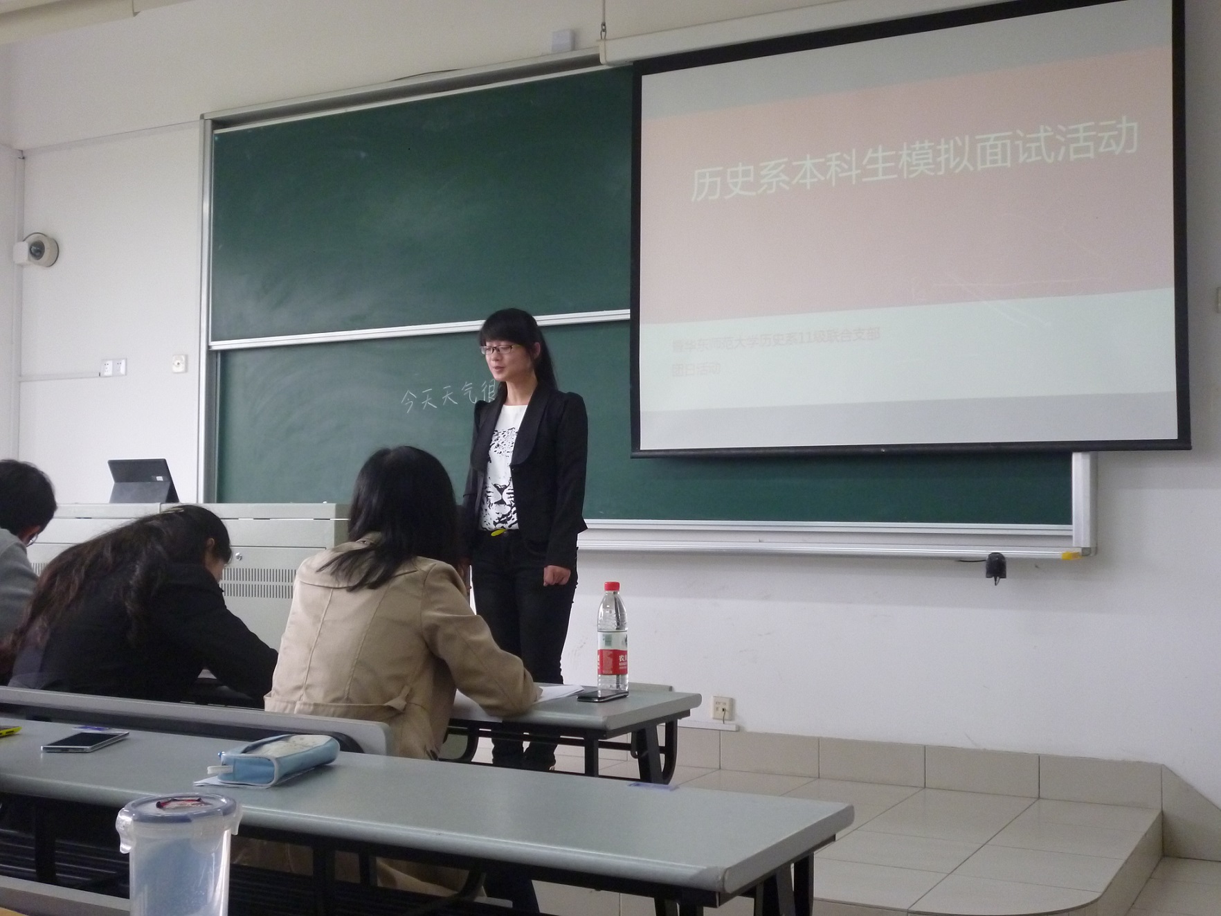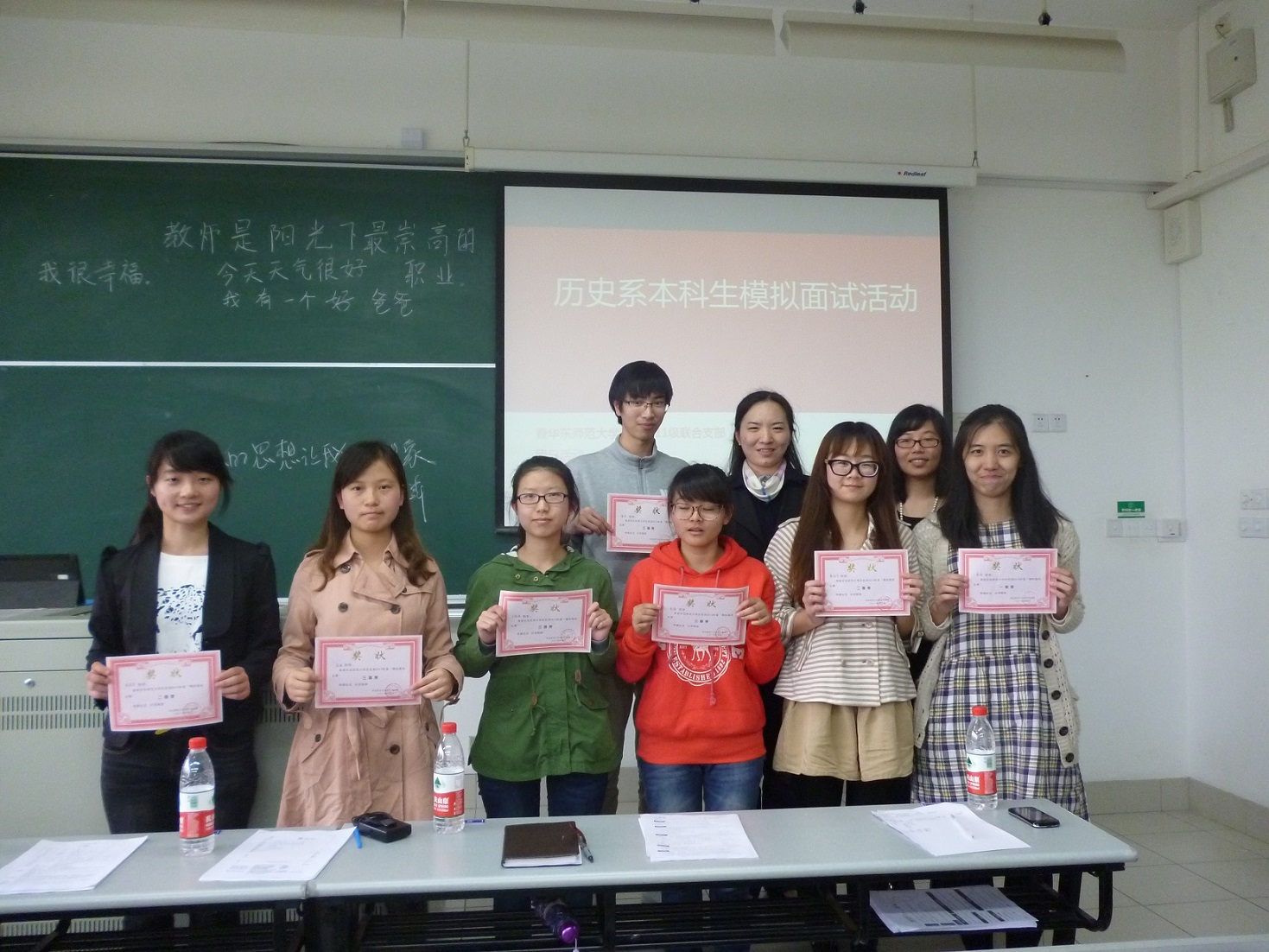 为提升学生就业竞争力,历史系于2014年4月16日下午,在一教237教室举办本科生模拟面试比赛。本次比赛邀请了历史系李炜菁老师、蔡慧贤老师,以及杨瑜、栾思源、张晨等三位2010级同学担任嘉宾。活动由徐赵倩同学主持。