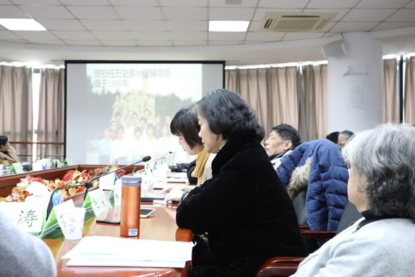 王令愉教授的夫人朱莉女士在致辞中表示,十分感谢众位老师、学生以及各方对王令愉教授的唁电,同时十分感谢历史系筹办了这次追思会。朱莉女士详细回忆了王令愉教授的病症情况,从病症的诊断、发展到治疗过程,以及王令愉教授的学生自发组织的陪护小组分担了王先生的护理工作,然而仍是无力回天。她表达了对先生的无限哀思以及对学生们的感谢。