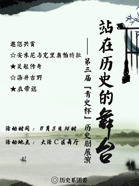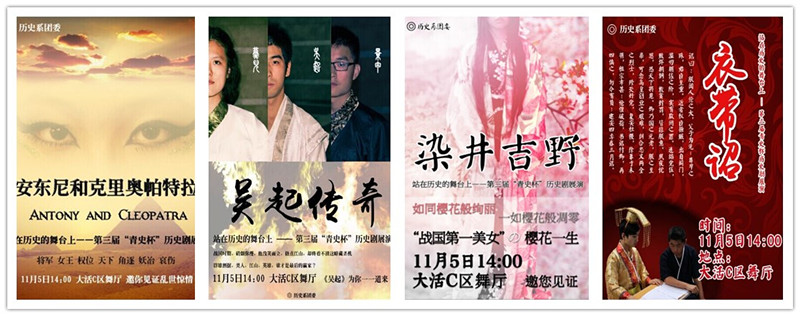 内容:共同欣赏由学生自编、自导、自演的四部历史剧《安东尼与克里奥帕特拉》、《吴起传奇》、《染井吉野》、《衣带诏》,共同感受历史的风云变幻。
