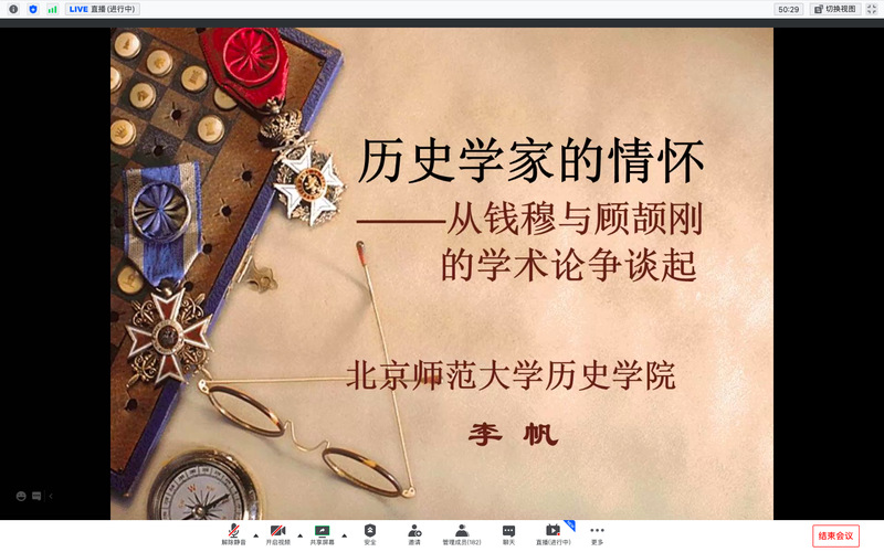 2020年10月26日晚,北京师范大学历史学院李帆教授以线上形式做客“大夏中国史名家讲坛”,并做题为《历史学家的情怀——从钱穆与顾颉刚的学术论争谈起》的学术讲座。本次讲座由华东师范大学det365在线瞿骏教授主持,共有近二百位校内外师生参与此次活动。