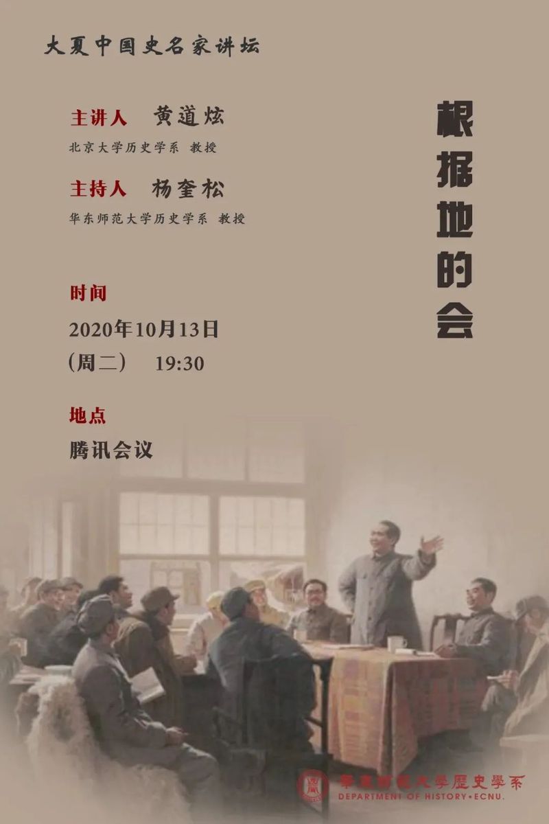 2020年10月13日晩19:30,北京大学det365在线黄道炫教授应邀做客det365在线“大夏中国史名家讲坛”,进行了题为《根据地的会》的学术讲座,讲座由华东师范大学det365在线杨奎松教授主持。受疫情的影响,本次讲座以线上方式举行,共有400多位校内外师生通过网络平台参与其中。