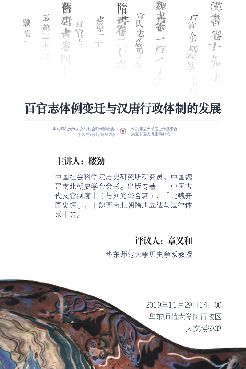 楼教授首先回顾了近年来中外学者对“百官志”体例问题的研究,认为正史中“百官志”体例变化的转折时期在北魏孝文帝太和年间。楼老师通过对比《汉书·百官公卿表》、《续汉书·百官志》和两唐书《职(百)官志》等文献,指出汉唐之间的“百官志”体例有三点变化。一是两汉百官志“以官存司”,唐代则“以司存官”,其记载中心从官员变为机构。二是前者所记多有官无吏,后者所记则兼及官吏,从“有纲无目”发展为“纲目俱全”。三是对存在不同行政关系的诸官,其记载从“以官相属”变成了“以职相从”,即从尤重人事从属关系转为尤重职务从属关系。