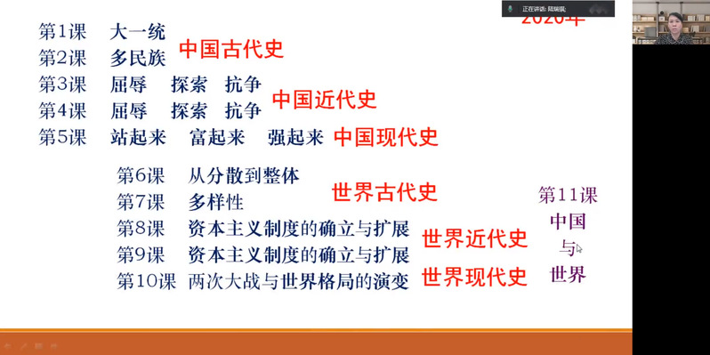 其次, 在“指向主旨和方法目标的单元教学的设计”后,陆瑞琪老师进一步分享了上海新课标改革中的“大概念”教学理念,展示了初中历史“大概念教学”示范性课程,以第11课“中国与世界”为范例介绍如何实现世界古代史、世界近代史、世界现代史的历史知识的有机整合。