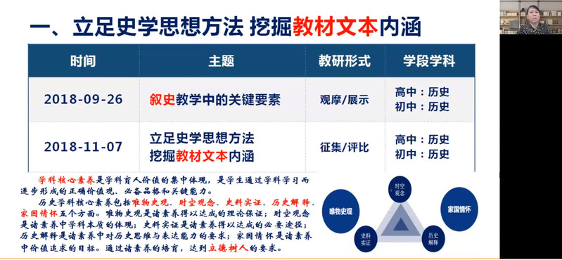 本次讲座着眼于新课标改革下的初中历史教学问题,从教师备课、上课两大教学环节切入,从“立足史学思想方法,挖掘教材文本的内涵”、“指向主旨和方法目标的单元教学的设计”以及“指向主旨和方法目标的单元教学的设计”三大方面结合具体的教学实践案例带来了精彩的分享。