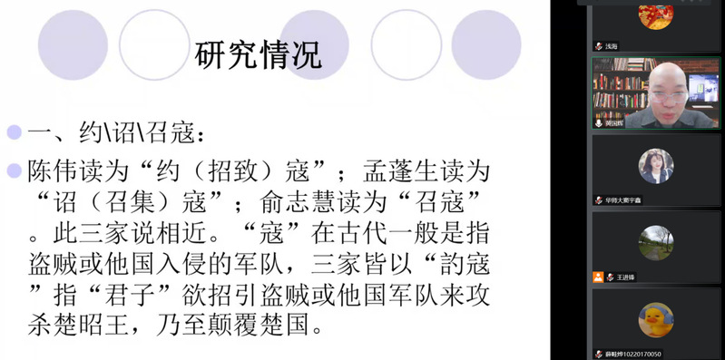 本场讲座主要围绕着先秦时期的君亲观念及其演变。黄国辉老师首先以上博简《昭王毁室》引入,重新释读“訋寇”。前人研究多将其释为“召寇”、“约寇”、“招寇”,其意相近,指欲招引盗贼或他国军队。黄老师认为“訋”字应读为“讨”,“訋”读音从“勺”,二者古音相近可通,“讨寇”者,击伐寇仇也。